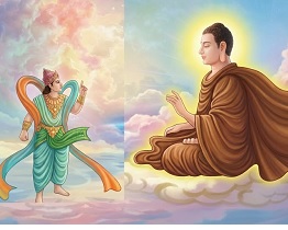 Enquanto o Buda meditava, uma luz radiante emanou dele, alcançando todo o mundo de Brahma — brilhante e magnífica. O Buda então apareceu diante de Brahma. Com as palmas das mãos unidas em reverência, Brahma disse:
